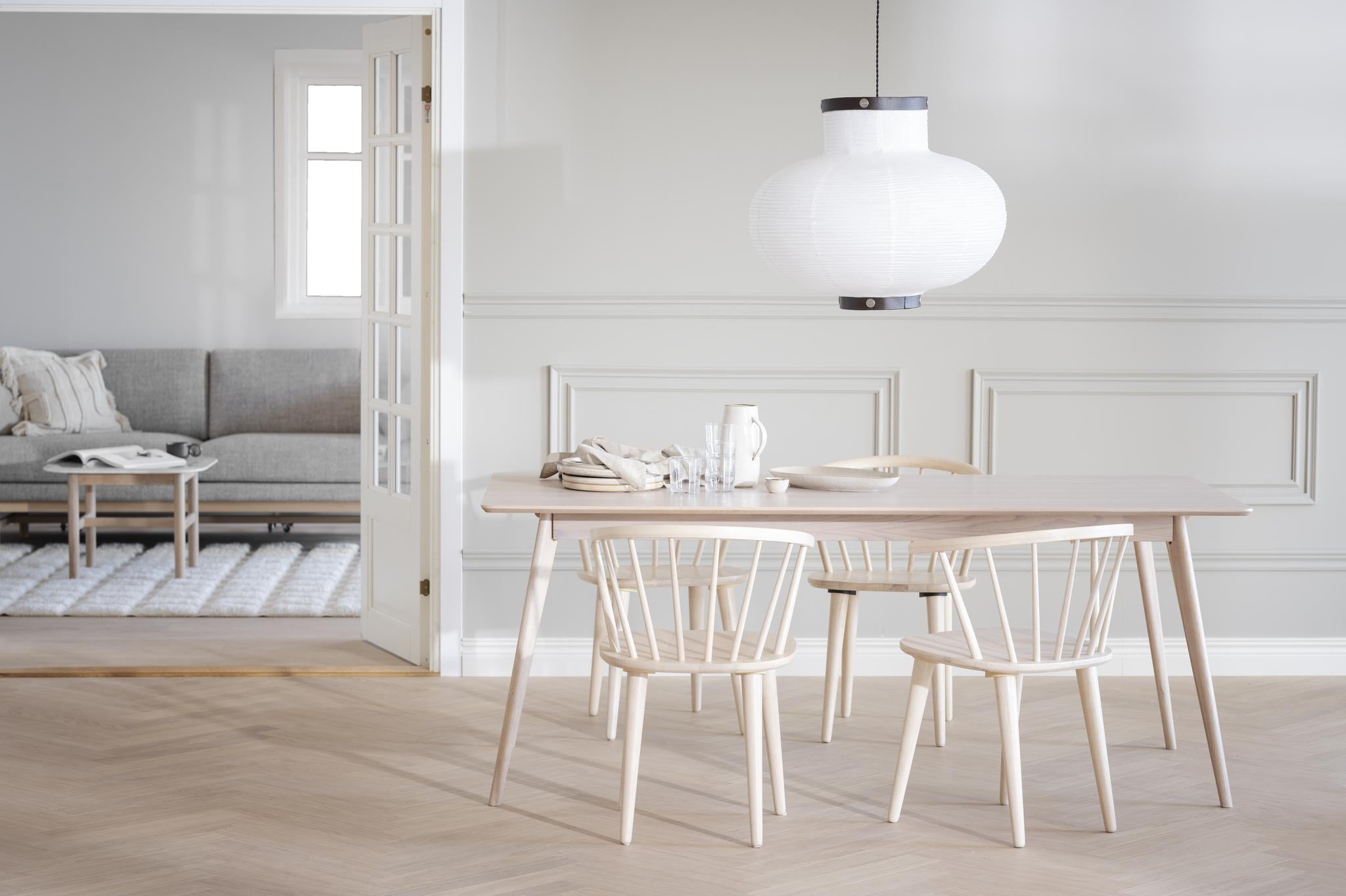 • Ljus matplats med ljust trä matbord, stolar och vit taklampa i skandinavisk stil